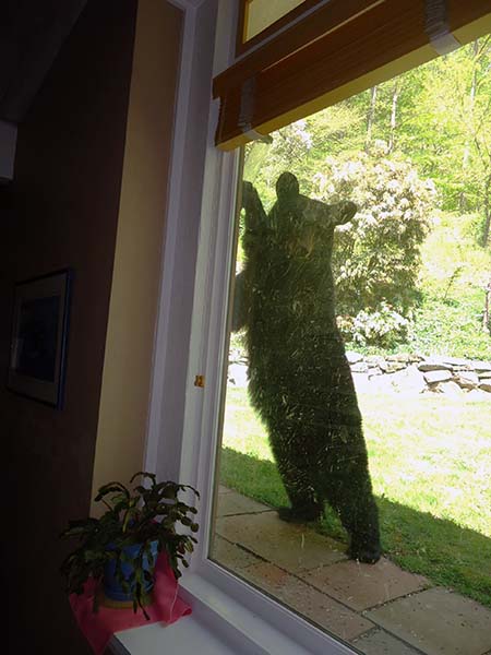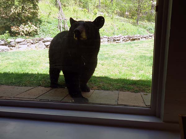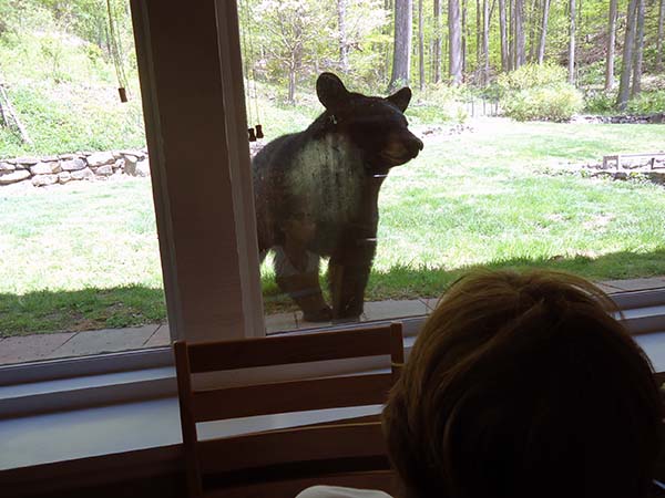 ![]() That is bear breath on the window. After checking us out she visited our compost containers, knocked them over, then went back to her cubs. On the way she did a strange shudder dance, with some foot stomps which must have been an all clear signal for the cubs as they soon shimmied down from their high perch. She got one cub at a time, sauntered off into the woods with them. We have decided not to put the bird feeders back up for awhile. It was a nice visit but we don't want to make her too welcome. . |