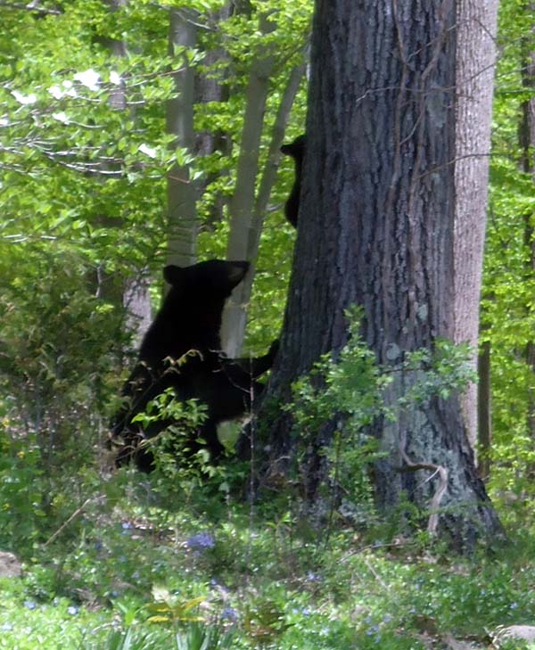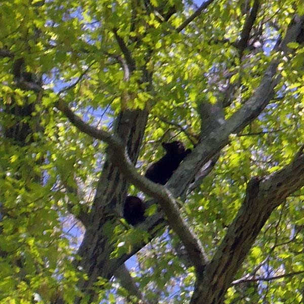 Bears...Oh My!Returning from a club run on Sunday, 5/5/13 we discovered a large black bear in our backyard. While we have bears as frequent visitors, this time it was special. She was not alone as she had 2 very small cubs nearby. When our dogs became aware of them and began barking the cubs scampered very quickly up the large oak tree. |