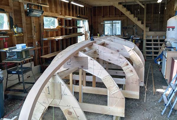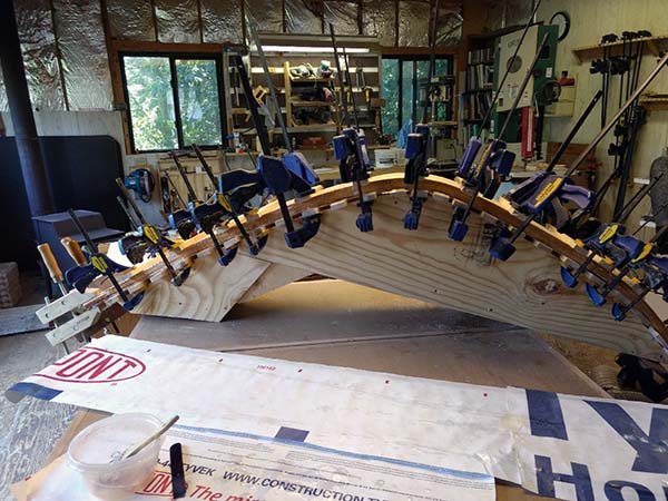 | Jigs were made to bend the beautiful vertical grain Douglas Fir to form the inner stems. It was milled by America's Wood, 16 lams 1/8" thick laminated 8 at a time. | ![]() |