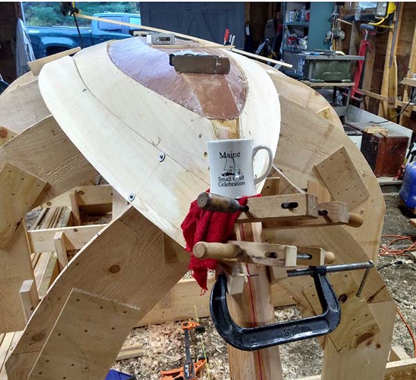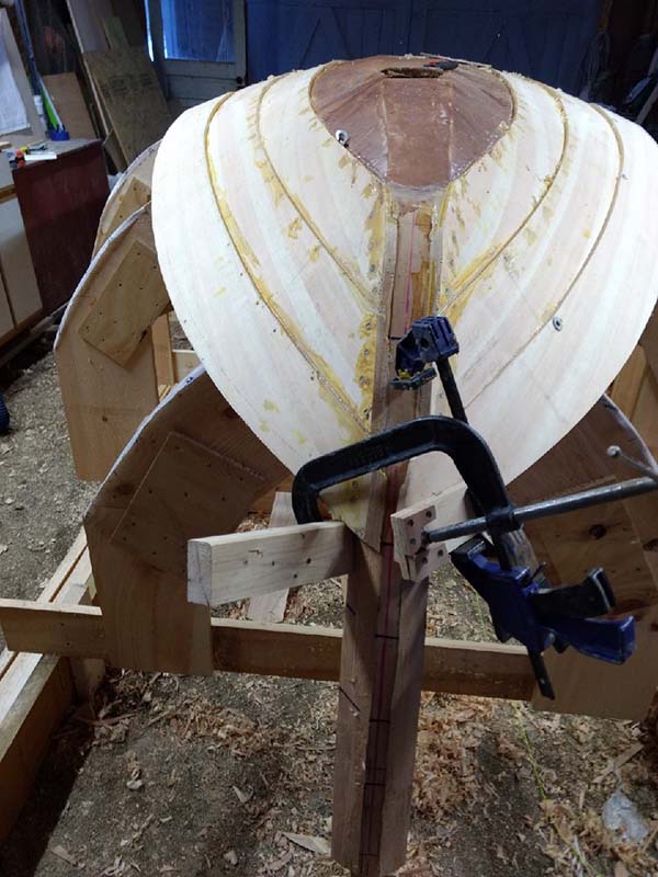 Working on the 4th plank, and since there are 8, I'm getting close to half way. But now it's winter and without heat it will be a few more months before there is anymore planking. Here I've finally got around to making a jig for clamping. If you look at the photos above you can see the crazy combo of clamps needed to coerce the planks around the stem. Once lathered with epoxy it was a slippery and frustrating mess, fighting any attempt to get the plank clamped back into position. |