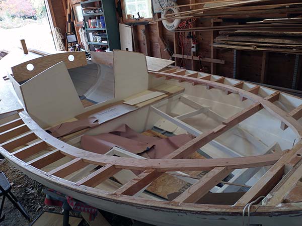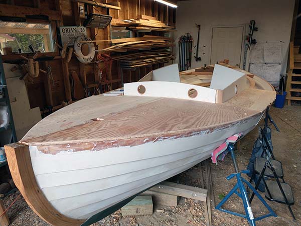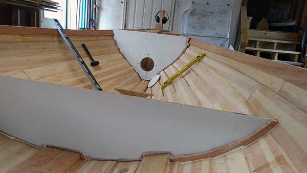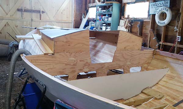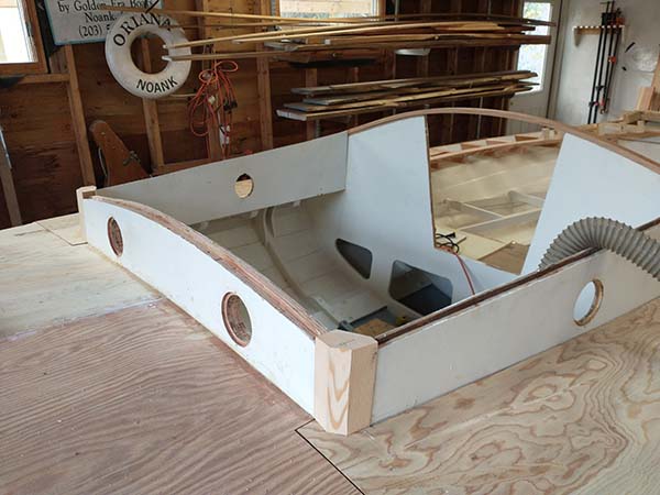 November 2020 Cabin sides have been doubled, 2 3/4" ply, glassed, on the front, 3/8"+ 4 mm on the sides. Ports routed, corner posts roughed in, steamed beam over the aft bulkhead to help with cabin top. |