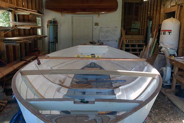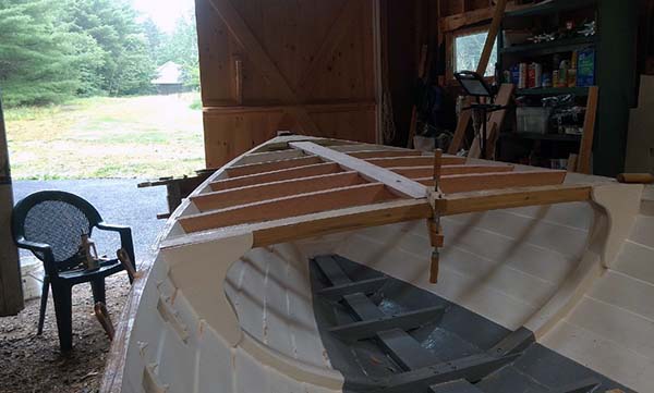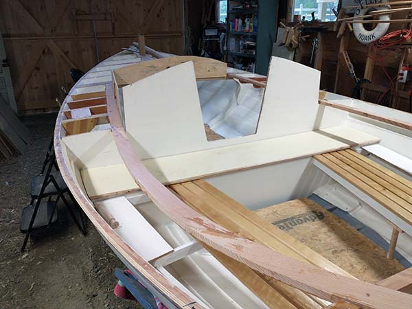 June 2020 May not look like it but a lot going on here. First the deck beam, 2 1/2x3 laminated BL is in place. Knees will tie it to the frames below. Toward the stern, seat risers were wrestled in place. It took some head scratching and force to get those installed. Not pretty but should be functional. The box at the aft bulkhead holds the outboard bracket which pulls out. Adding that watertight bulkhead meant the seating had to be redesigned. I'm waiting on the bilge keels before continuing with that project. . |