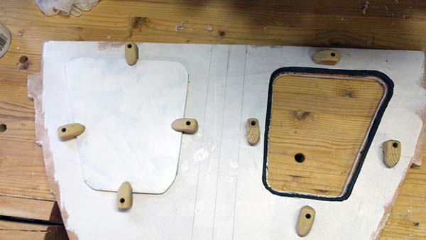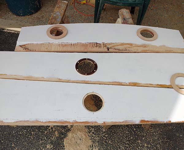 More holes in the boat. At least these are above the WL. Holes are routed and rabbeted to fit the bronze Duckworks ports. The cabin sides will be doubled 3/8" marine ply and glassed. The front will be doubled 3/4" for added strength as the mast tabernacle will be affixed there. Decking and corner posts are next, some finicky joinery. |