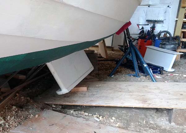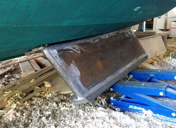 | The bilge keels arrived! Jeb did a real nice job. I surprised myself by getting one dry fitted and it did fit! It took a lot of raising and lowering the hull, digging a hole in shed floor to fit the jack (another good reason to have a dirt floor) and nudging the 200# keel to line up the bolt holes. | ![]() |