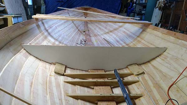 | The lid is on, temporarily. 4mm Okoume is dry fitted and it did fit the camber with only a minimum of complaining. It will laminated with 3 layers, glassed inside for strength, Dynel outside. Now to build the jig for the laminating. | ![]() |