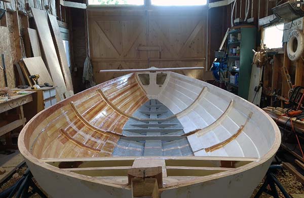 May 2020 Spring is here and with stay at home pandemic restrictions there in no excuse not to make progress. Here the interior has 2 coats of epoxy, stbd side primed, bilge fiberglassed (10oz) and one coat of epoxy bilge paint. |