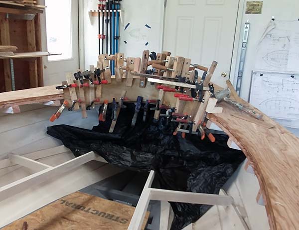 I knew the curved coaming would be a challenge since first viewing the plans. I milled a 1/2" x 6" plank of BL and since it didn't fit in my steam box I resorted to hot towels. With persuasion, it took the bend. In the back I'm training the other plank with wet towels and lead. Next up, real fun, getting the tight curvature at the aft end in place and match the planks. |
