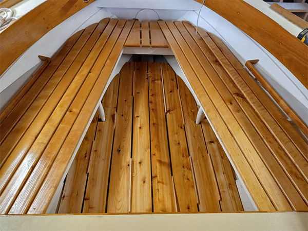 Cockpit sole made of cedar milled by my old Navy roommate's brother. He has a large farm about an hour north in Exeter and set up a sawmill to do something with all the trees on his property. They also brought down a truckload of butternut, not a boat building wood, but will find some use for it. The seats are yellow birch, coaming black locust, quite a mix of woods. |
