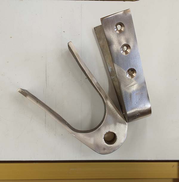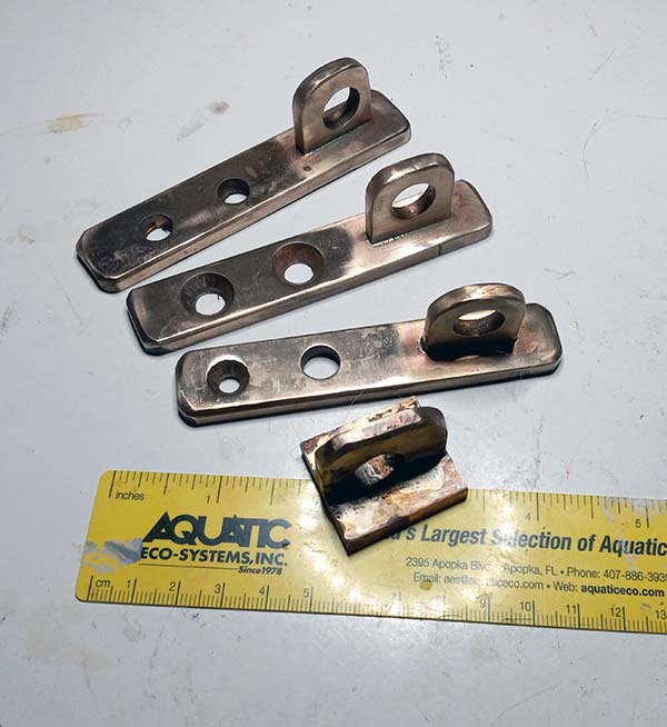Brazing we will go! After taking classes at WoodenBoat School I made my first fixtures using an oxy/acetylene torch and silver solder. The small one was from pieces of scrap for practice then a test. As advertised the joint proved stronger then the material as I clamped it in a vice and pounded it with a hammer. The metal bent but the joint held. How does it do that? |