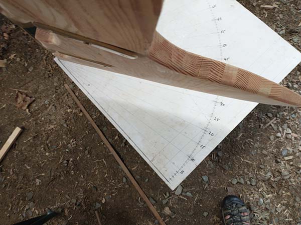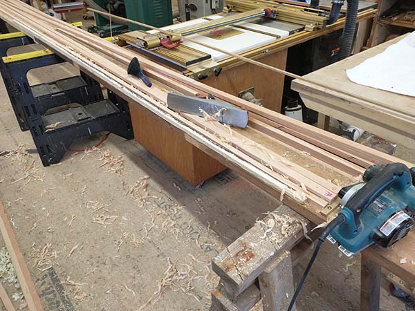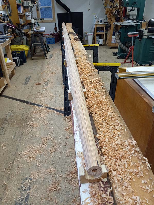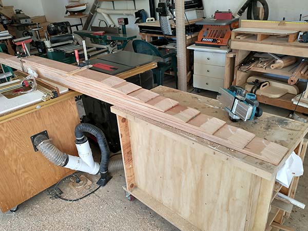 After cutting the birdsmouths on the router table with a 60/30 bit, all 12 need to be tapered. The top 10' goes from 4.25" to 2" following a parabolic curve with only 3/16" reduction in the first 30"...not much too take off over 12 staves. I made a jig and started the taper with the power plane then finished with a hand plane.