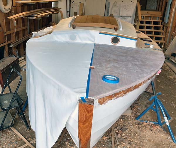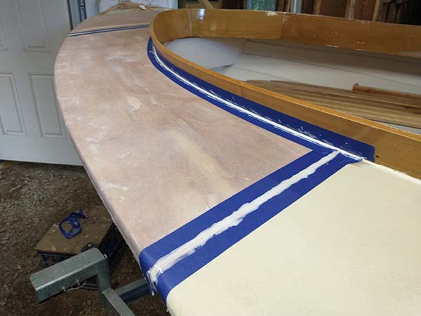 Took a break from stripping and re-varnishing Rivus and Dynel-ed the foredeck. Now on to cockpit coaming and more challenging wood working. |