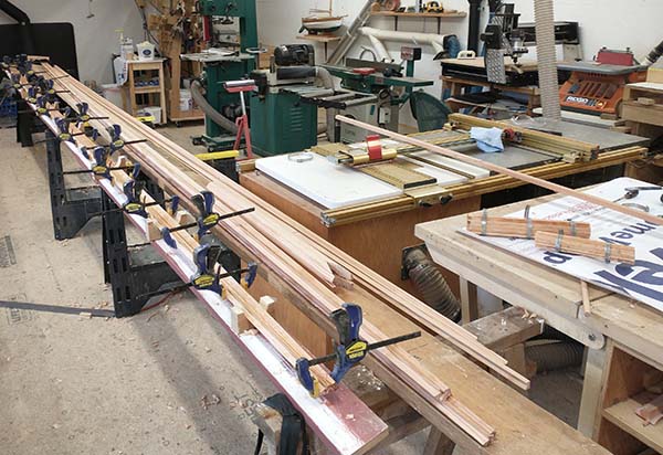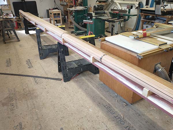 Whose idea was it to make a 12 stave birdsmouth mast? NM, I know who. After checking with local lumber yards and sawmills I couldn't find 22' lengths of DF so I used available VG DF staggered the scarfs to 23+'. They were then ripped to 1.11 widths from the Duckworks calculator.