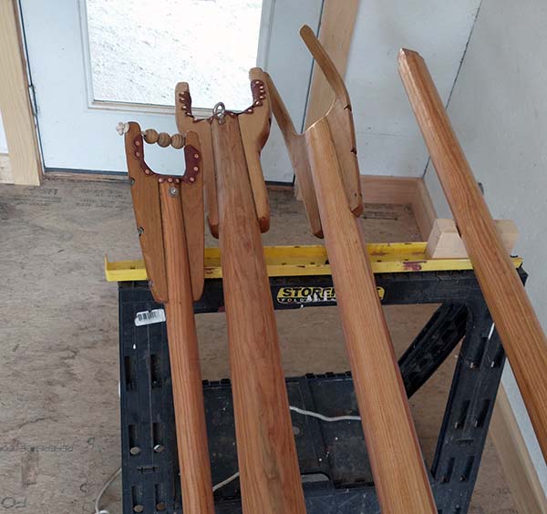 Reworking the spars that I made the previous winter. If I go with the mizzen, these need to be cut down to fit. This is the main boom and gaff. Suppose I should make a mast sometime. |